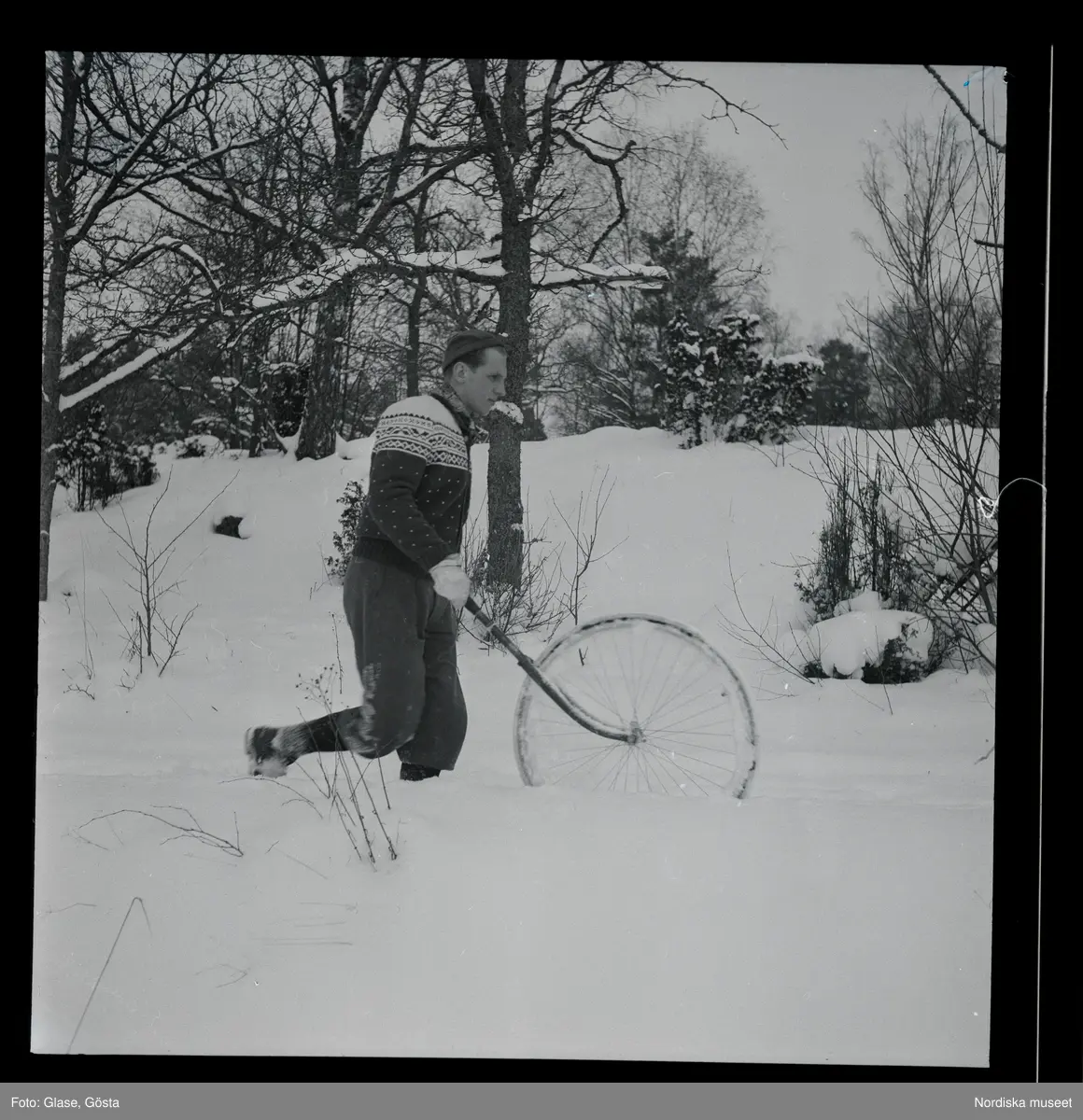 Hellasgården, Ringblom med fru på trappan samt skidåkaren Göte Andersson, 15-12-1944.