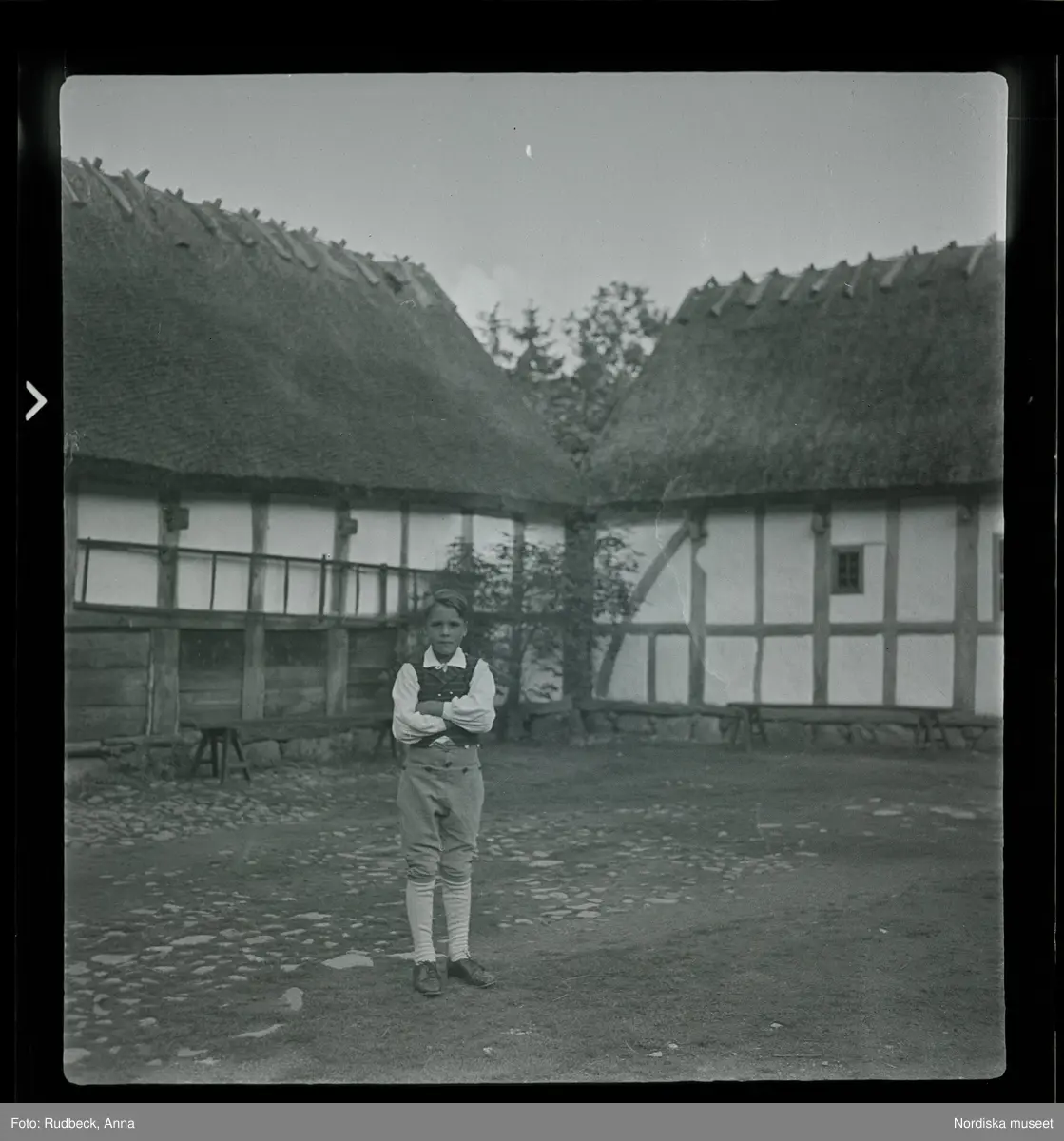 91 Skansen Ringleksbarn. En pojke i folkdräkt, utomhus på Skansen.