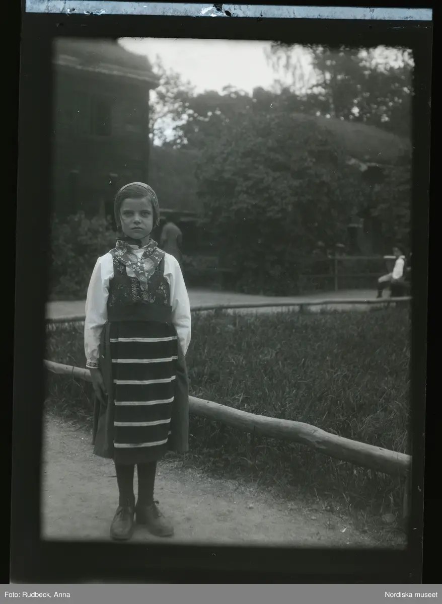 35 Skansen Ringleksbarn. En flicka i folkdräkt, utomhus på Skansen.