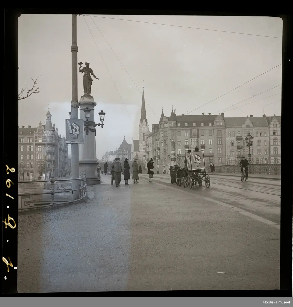 Djurgårdsbron. Reklam för Skansen julmarknad söndag 8 dec.