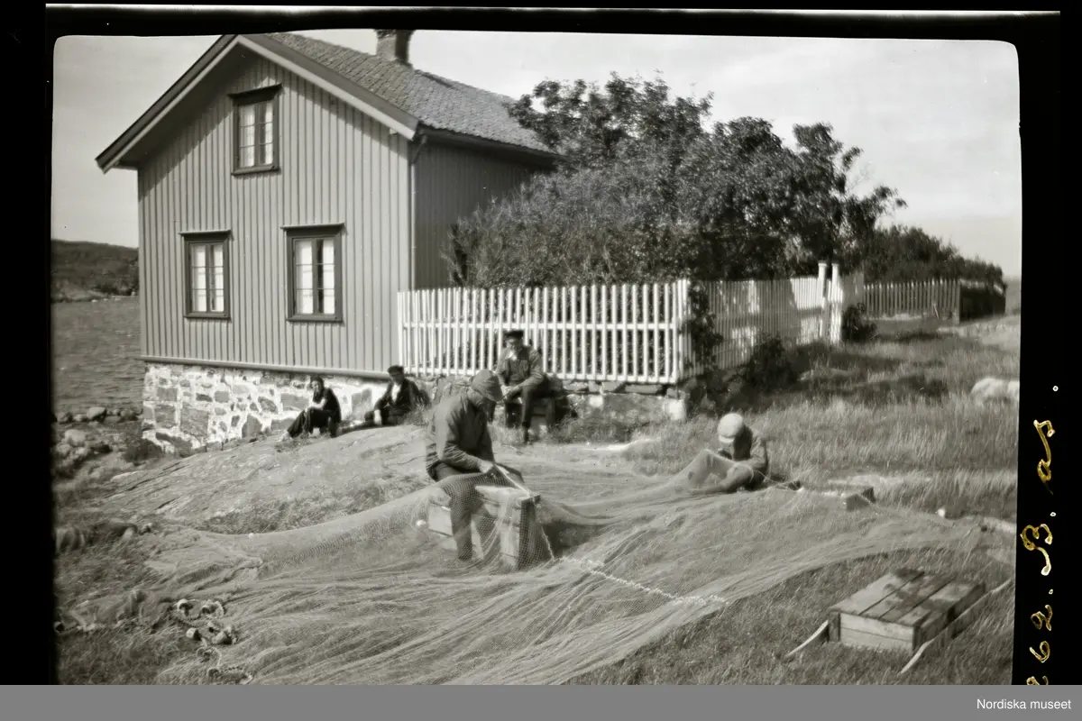En man och en pojke sitter utanför ett hus och lagar fiskenät.