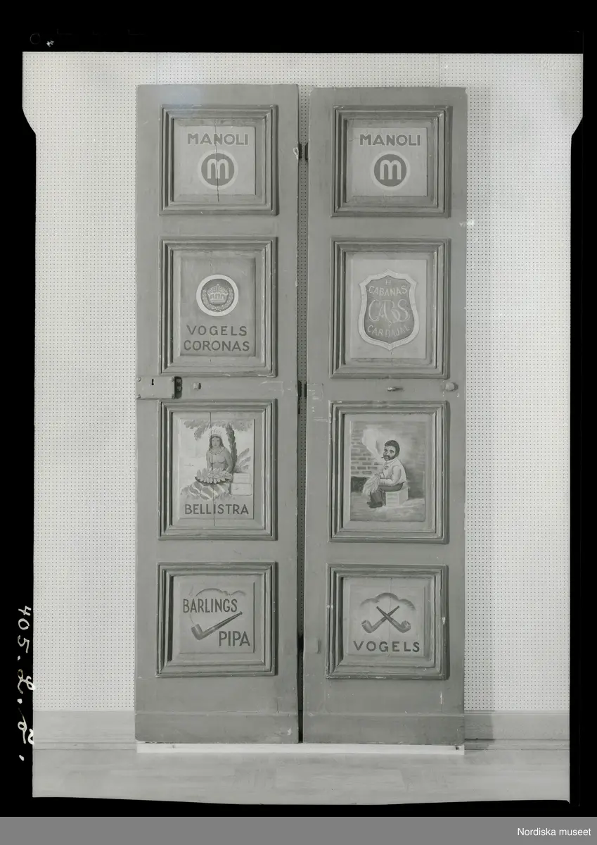 Dörrar med bemålade paneler som gör reklam för olika varumärken.