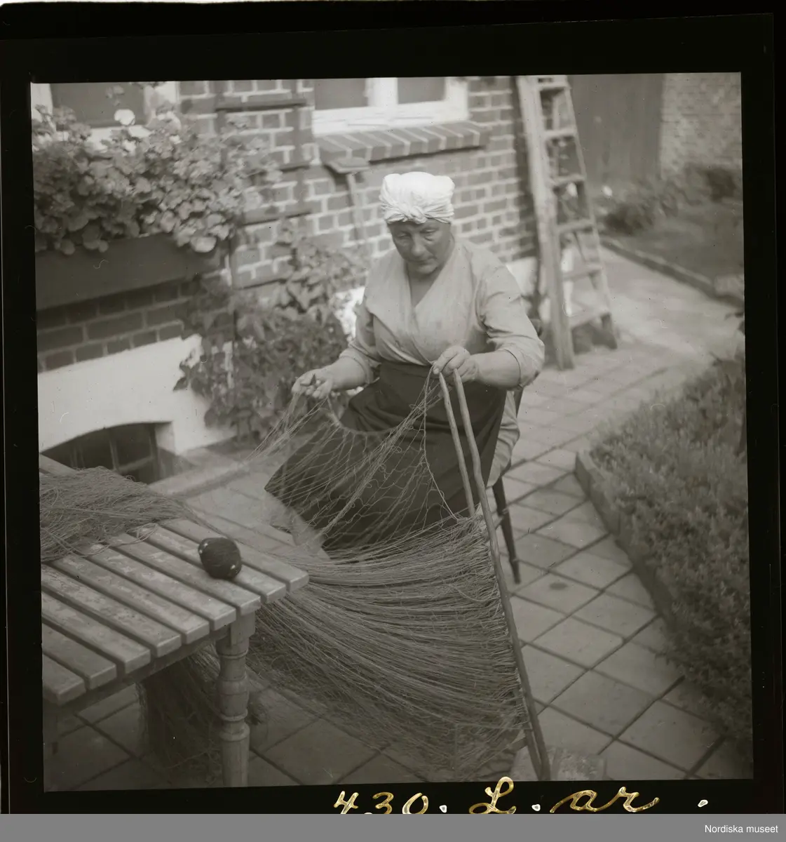 Text på montering i arkivet: Fru Louise Nilsson "bödar" garn. Träklykan garnen äro uppträdda på är den s.k. "klåven".