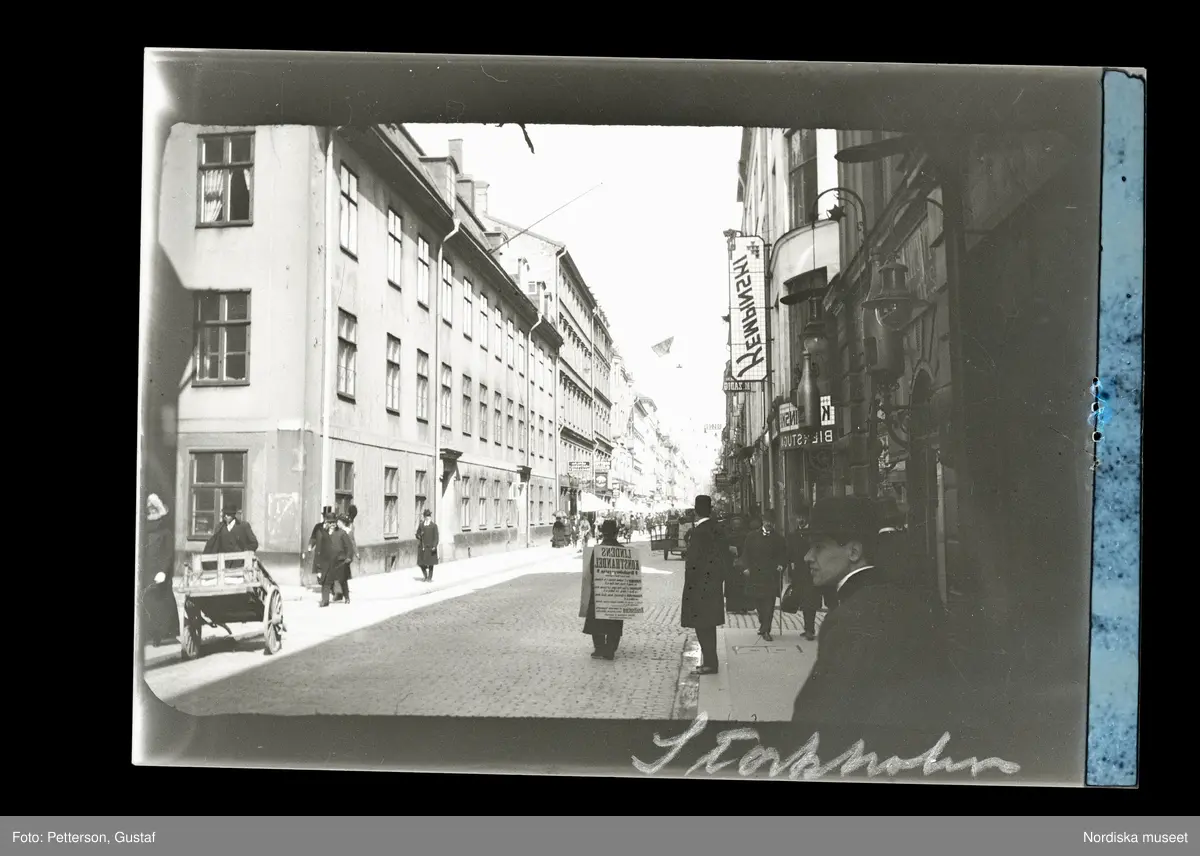 På en av Stockholms gator står en man med reklamplakat för Lindéns konsthandel över kroppen.