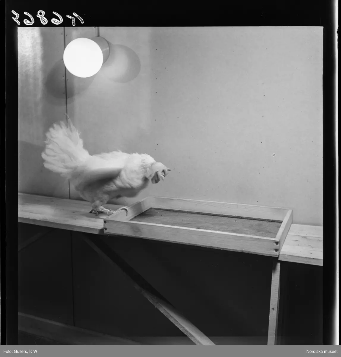 507 E Ultuna Fjäderfälaboratorium. En höna på ett bord.