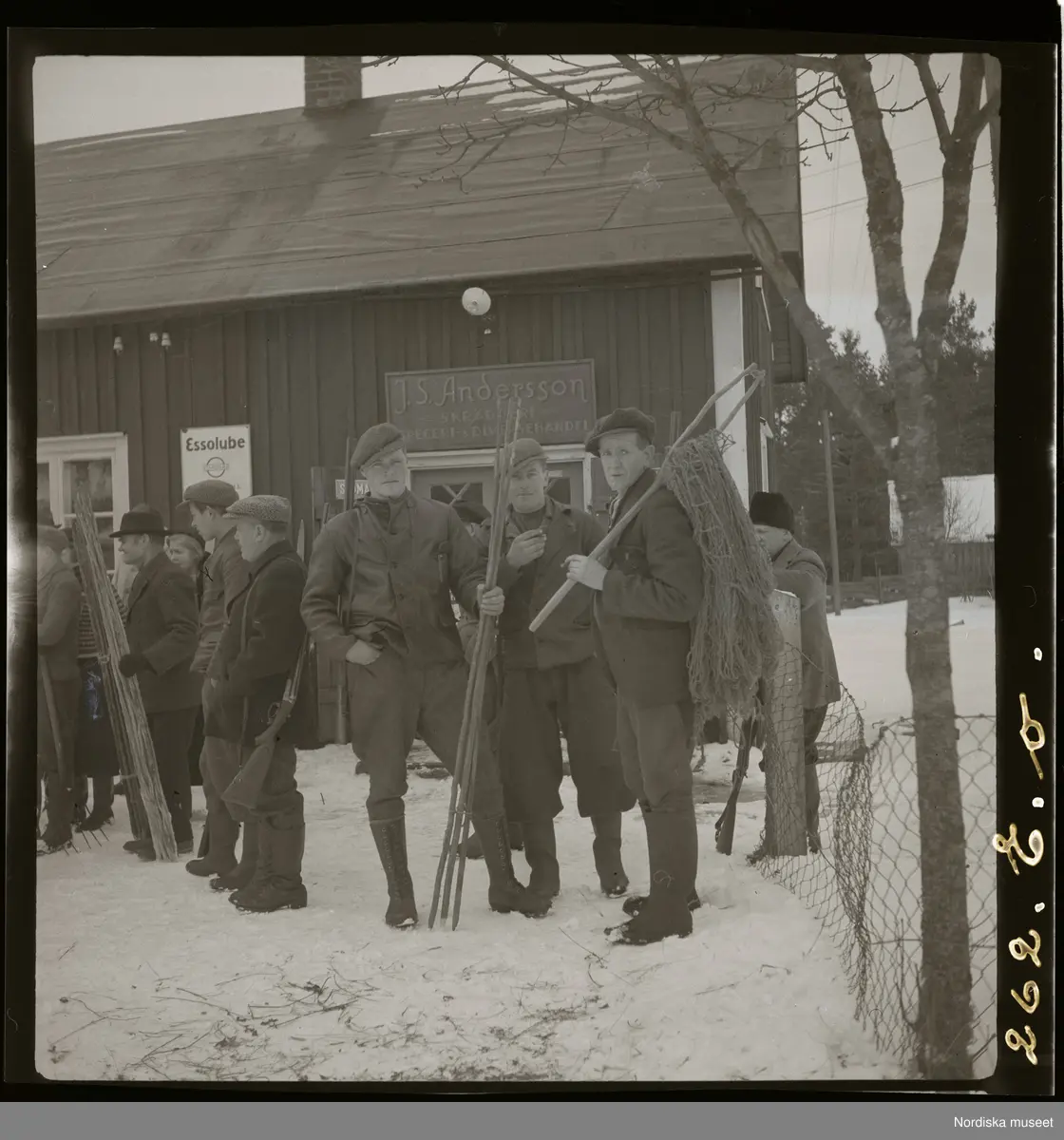 Tre män i ett jaktlag framför J. S. Anderssons skrädderi, speceri- & diversehandel.