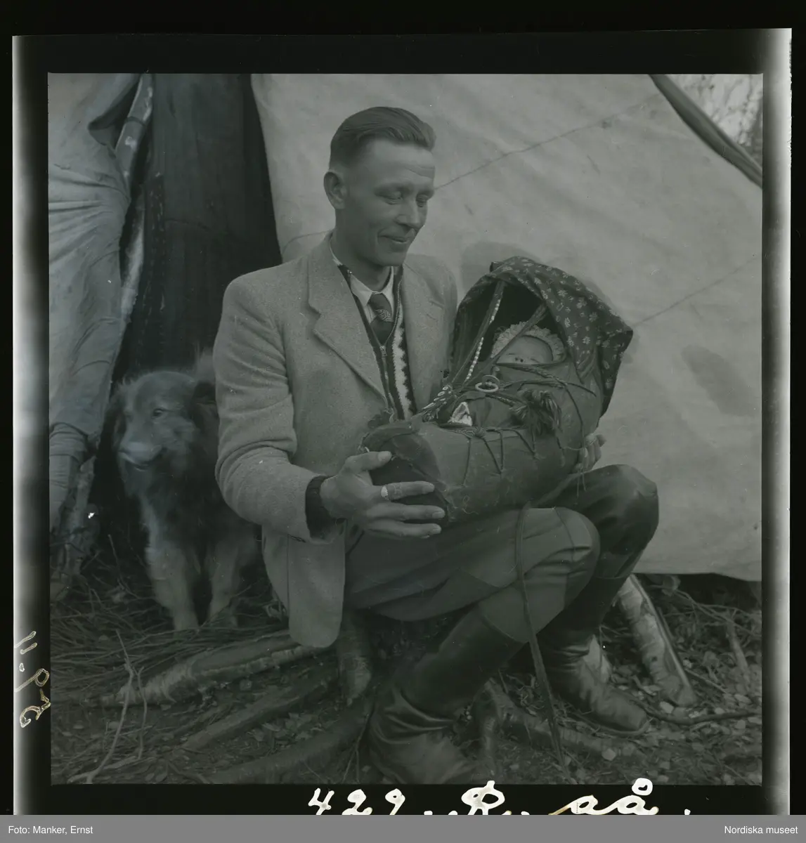 En man klädd i slips och kavaj sitter utanför en kåta. I knät har han en komsio/ geittka, en samisk vagg, med ett litet barn i.