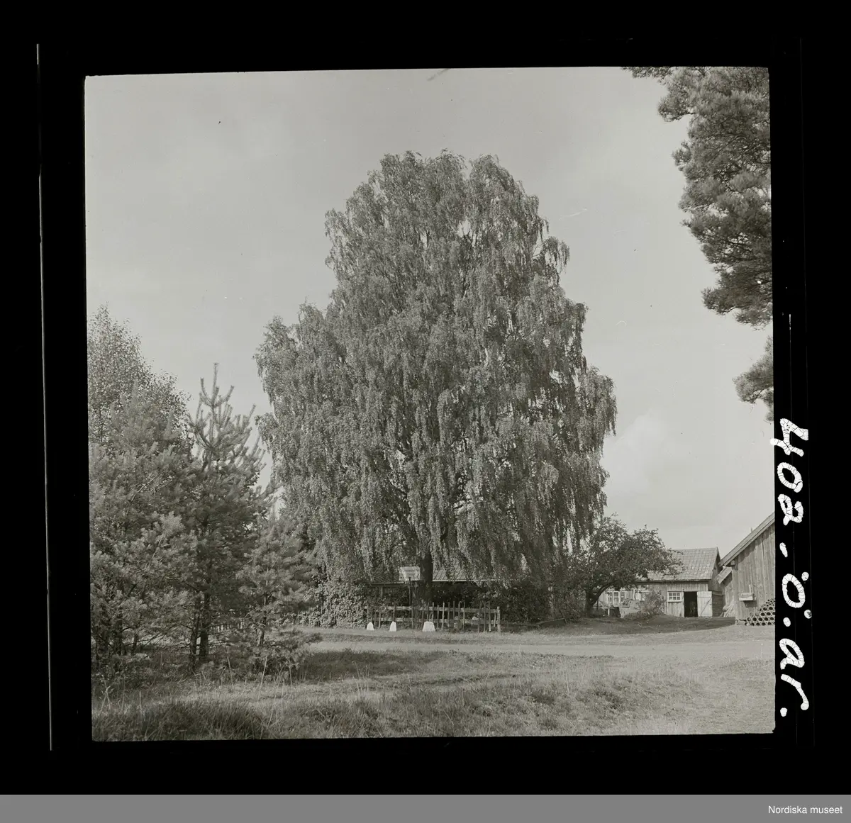På en gård står ett stort träd med skylt på stammen: "Naturminnesmärke. Fridlyst Enl: lagen av den 25 juni 1909".