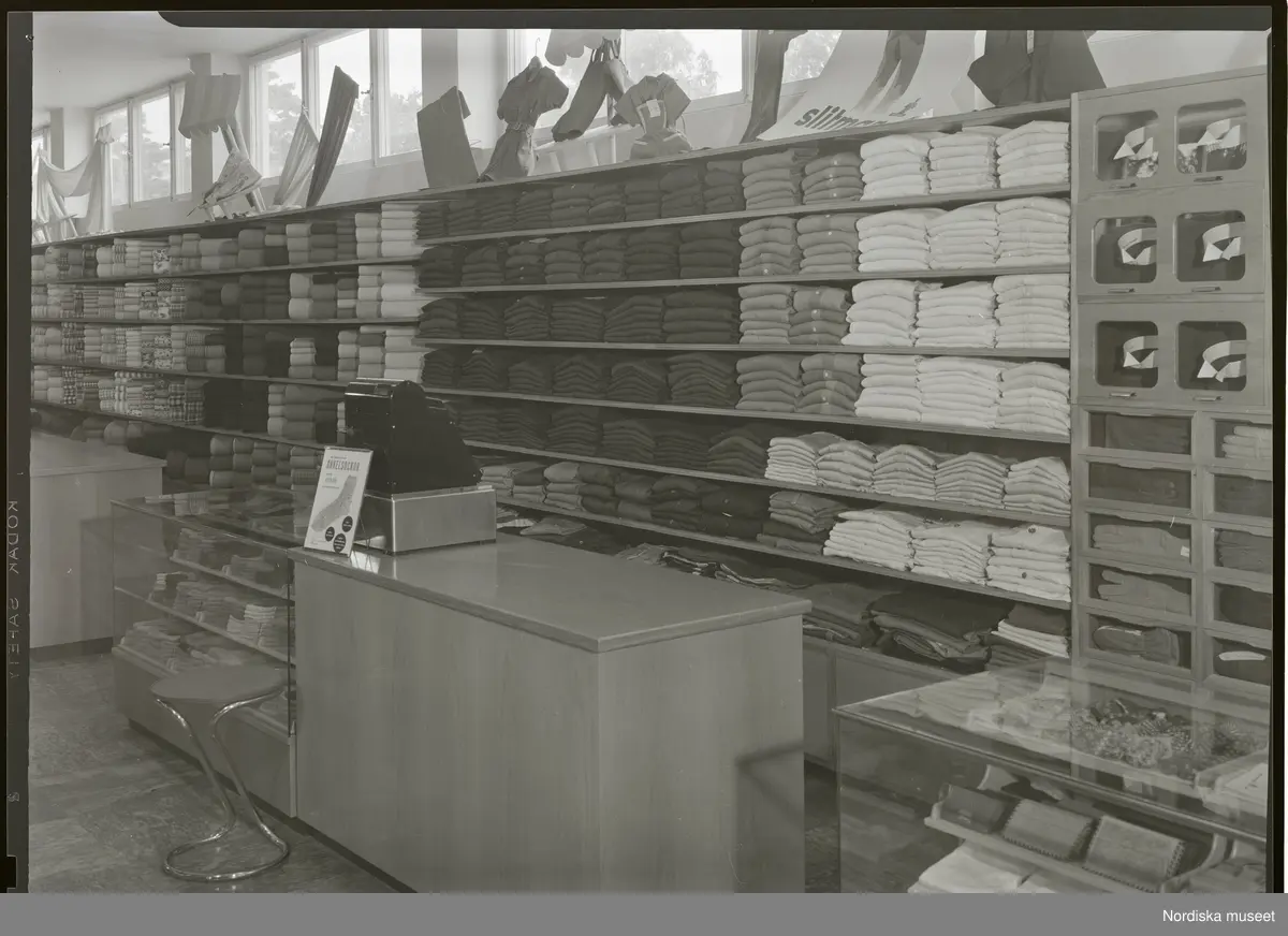 Butik med prydligt fyllda hyllor med arbetskläder "slitman". Dokumentation av Slitmanfabriken ABs verksamhet.