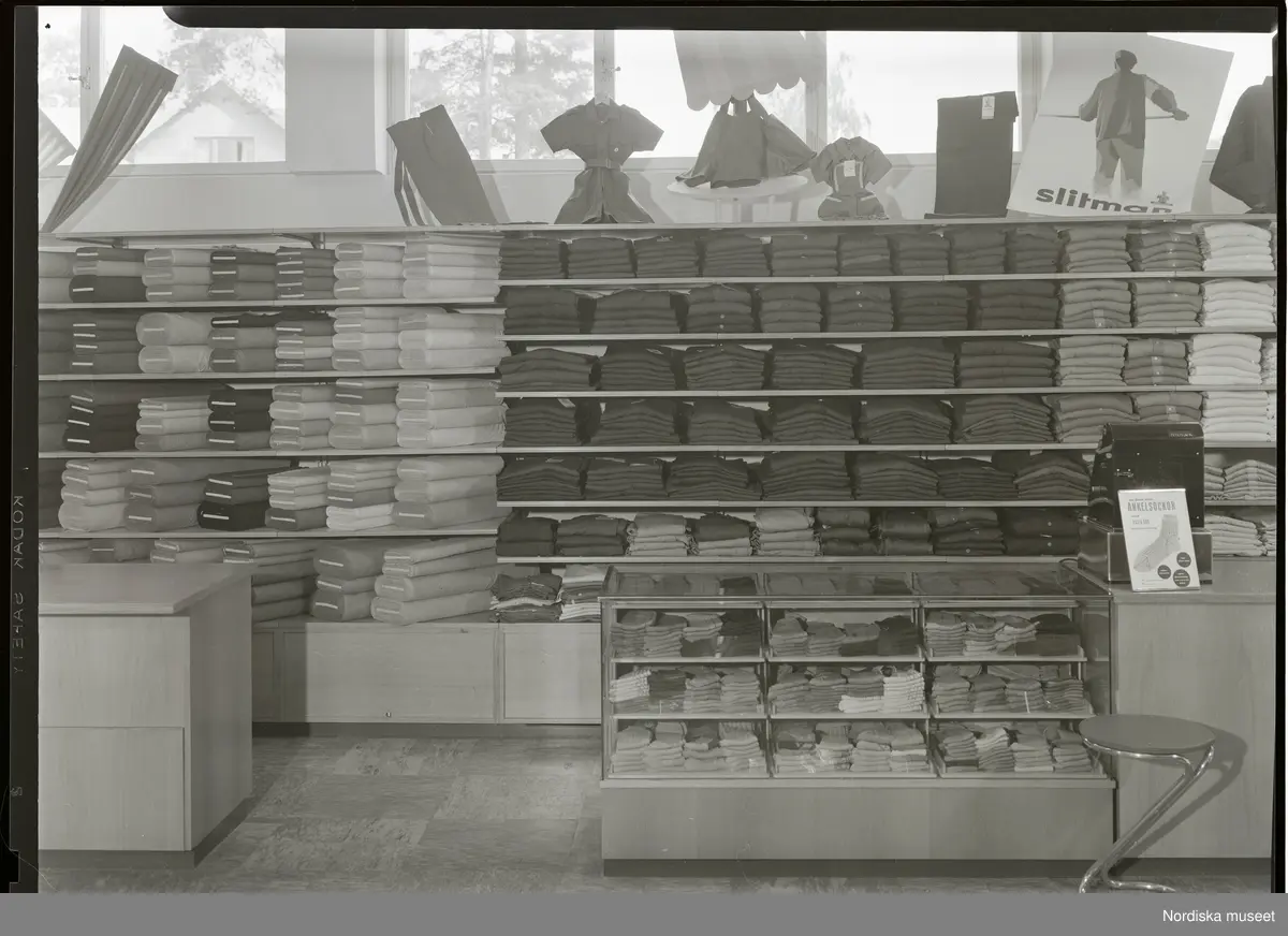 Titel: Butik med prydligt fyllda hyllor med arbetskläder "slitman". Dokumentation av Slitmanfabriken ABs verksamhet.