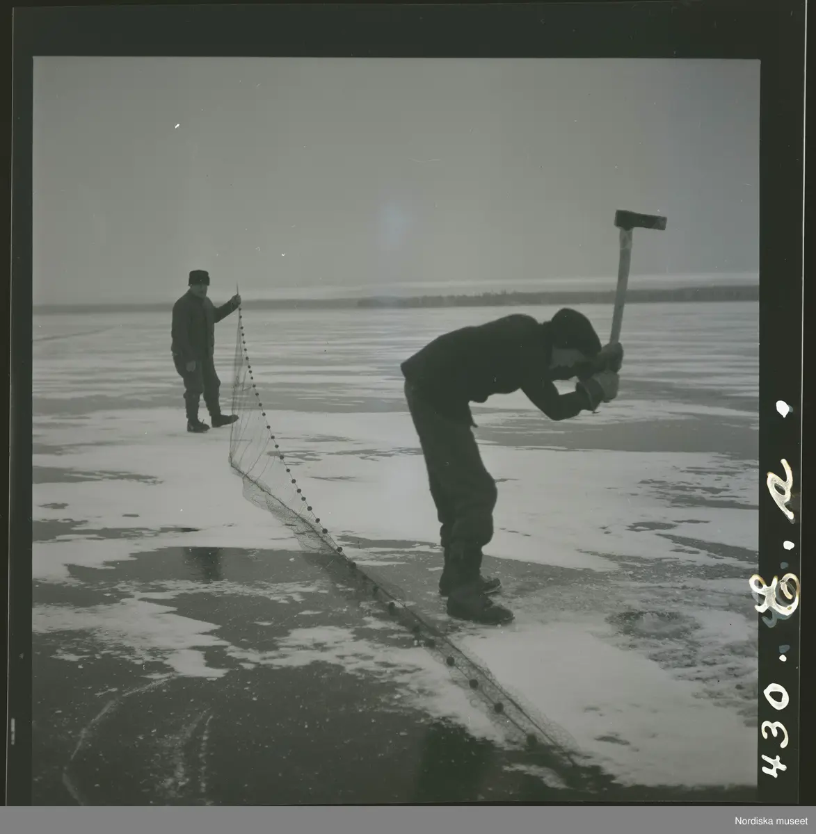 Titel: Vinterfiske på sjön. Det fiskas genom hål i isen.