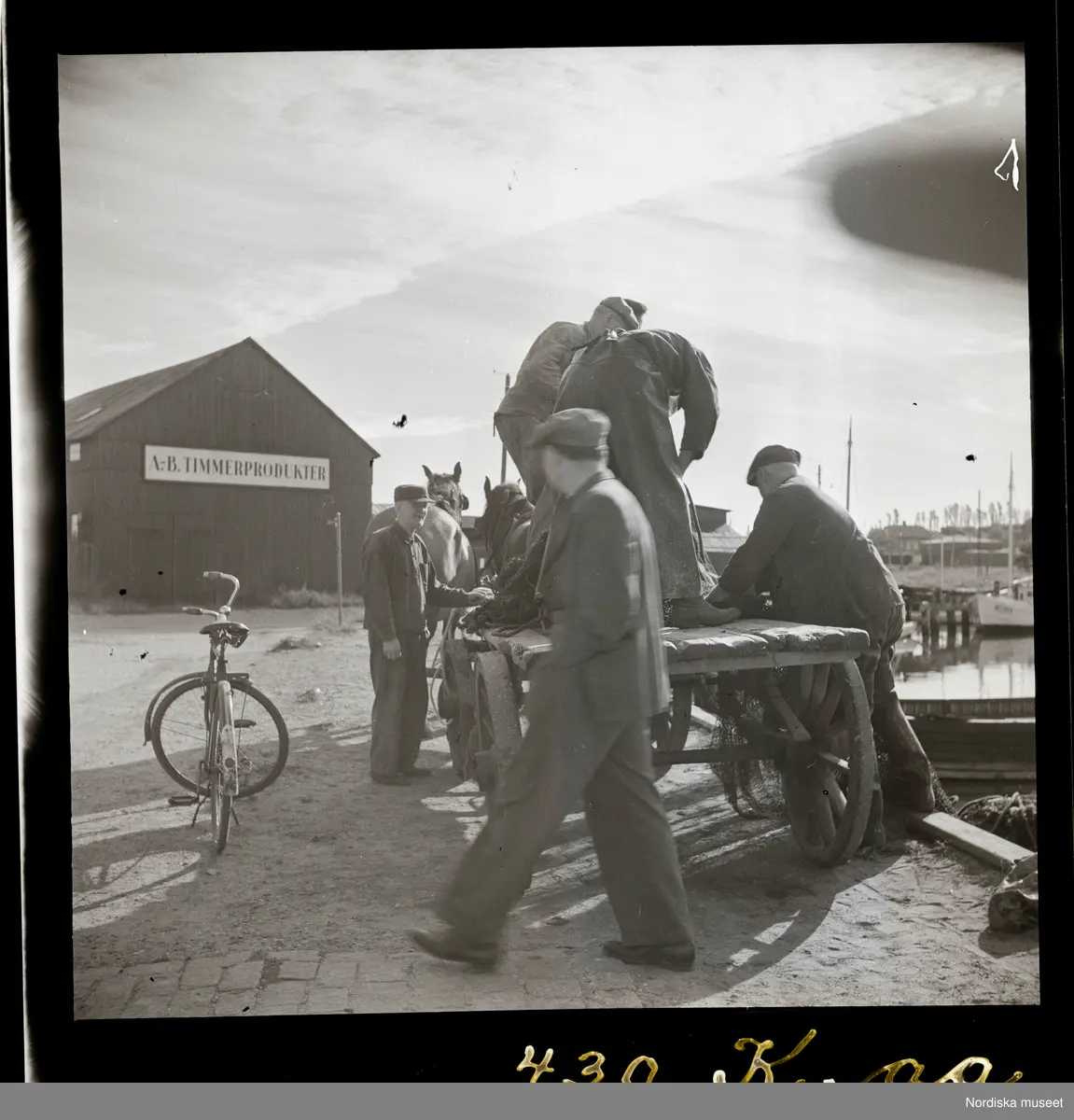 Text på montering i arkivet: Bottengarnen halas av laget från båten upp på bonden Ingels vagn och köras till torkplatsen vid Åkroken.