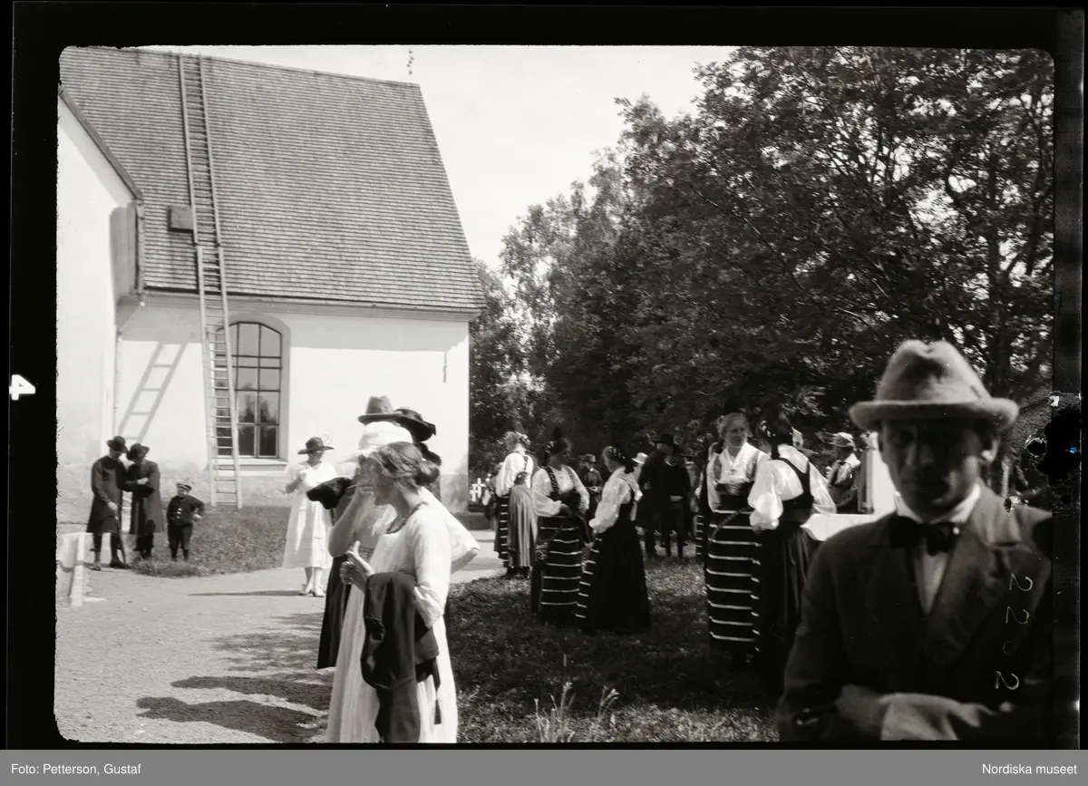Människor framför Rättviks kyrka, vissa klädda i folkdräkt.