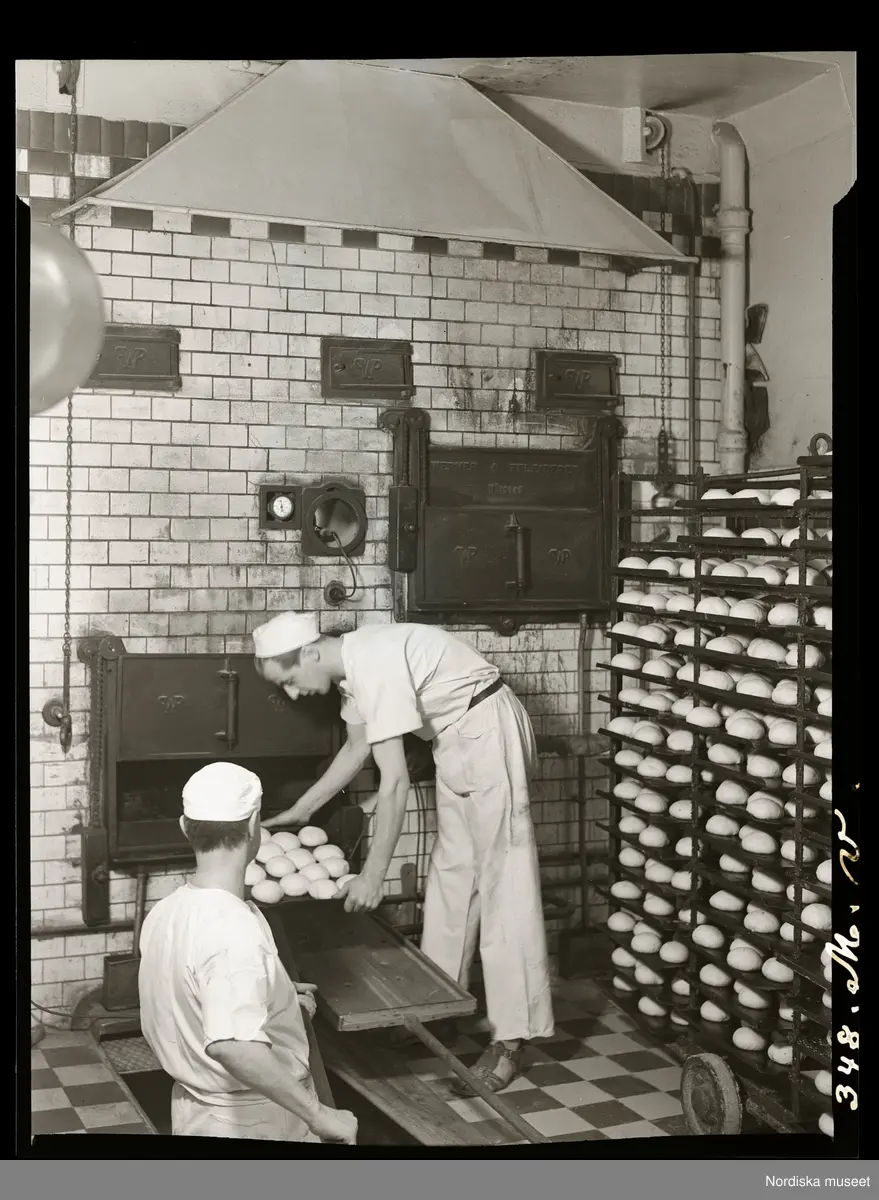 Bageri. Semlor bakas, en ung man ställer in en plåt i ugnen.