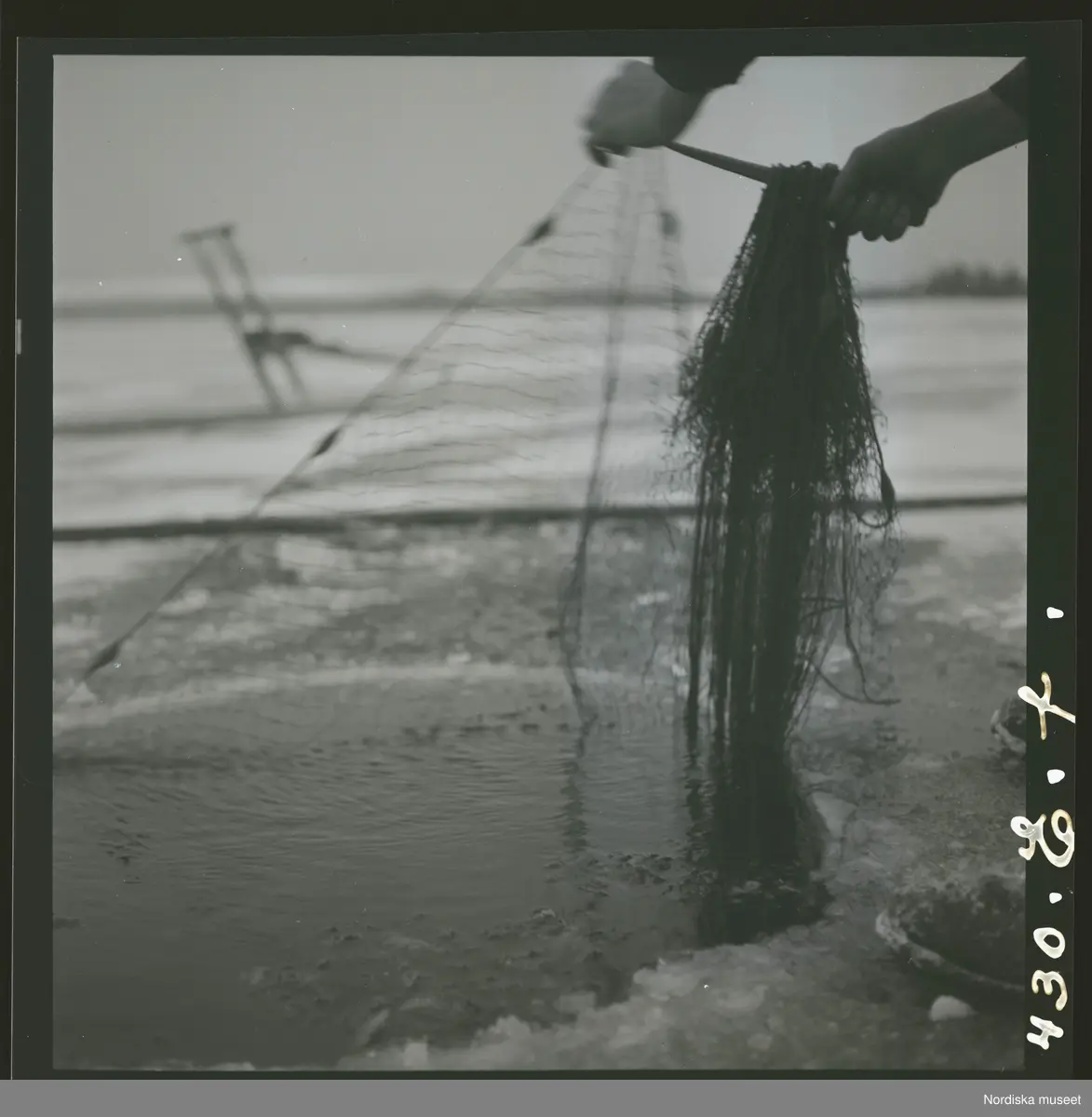 Vinterfiske på sjön. Det fiskas med nät genom hål i isen.