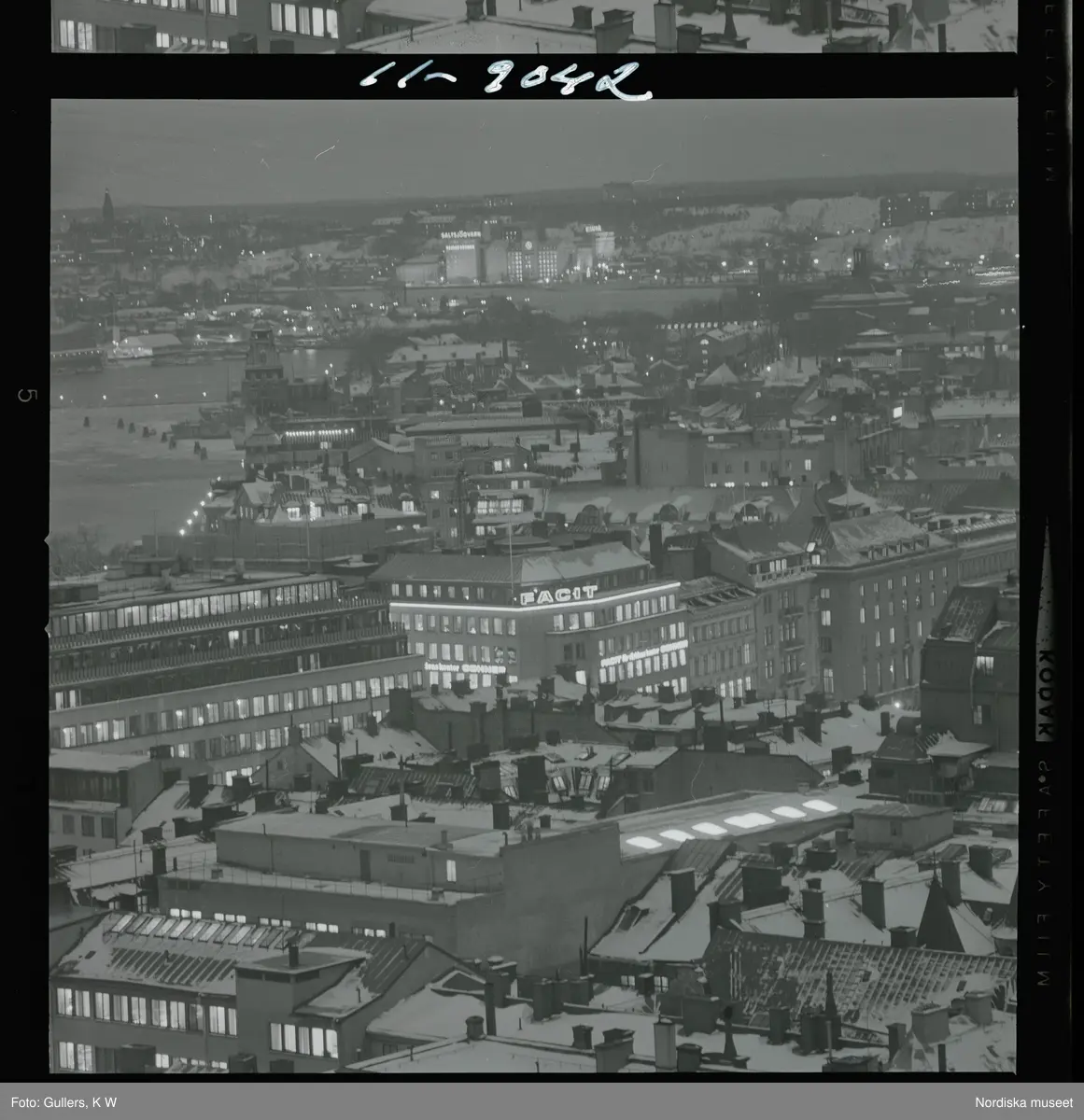 Titel: 585/40 Facit Nattbild från N.K + Södra Kungstornet. Kvällsbild. Facit-skylt på taket av fastigheten Styrpinnen 22, ritad av arkitekt Ivar Tengbom i hörnet Hamngatan / Kungsträdgårdsgatan i Stockholm.