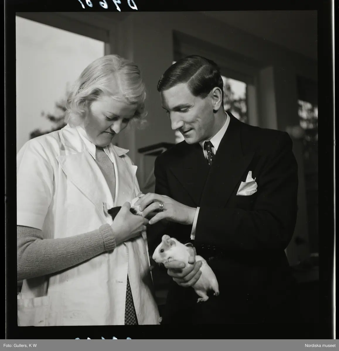 Arbete i labb vid Statens Institut för folkhälsan (myndighet verksam mellan åren 1938 - 1971). En man och en kvinna håller försöksdjur marsvin.