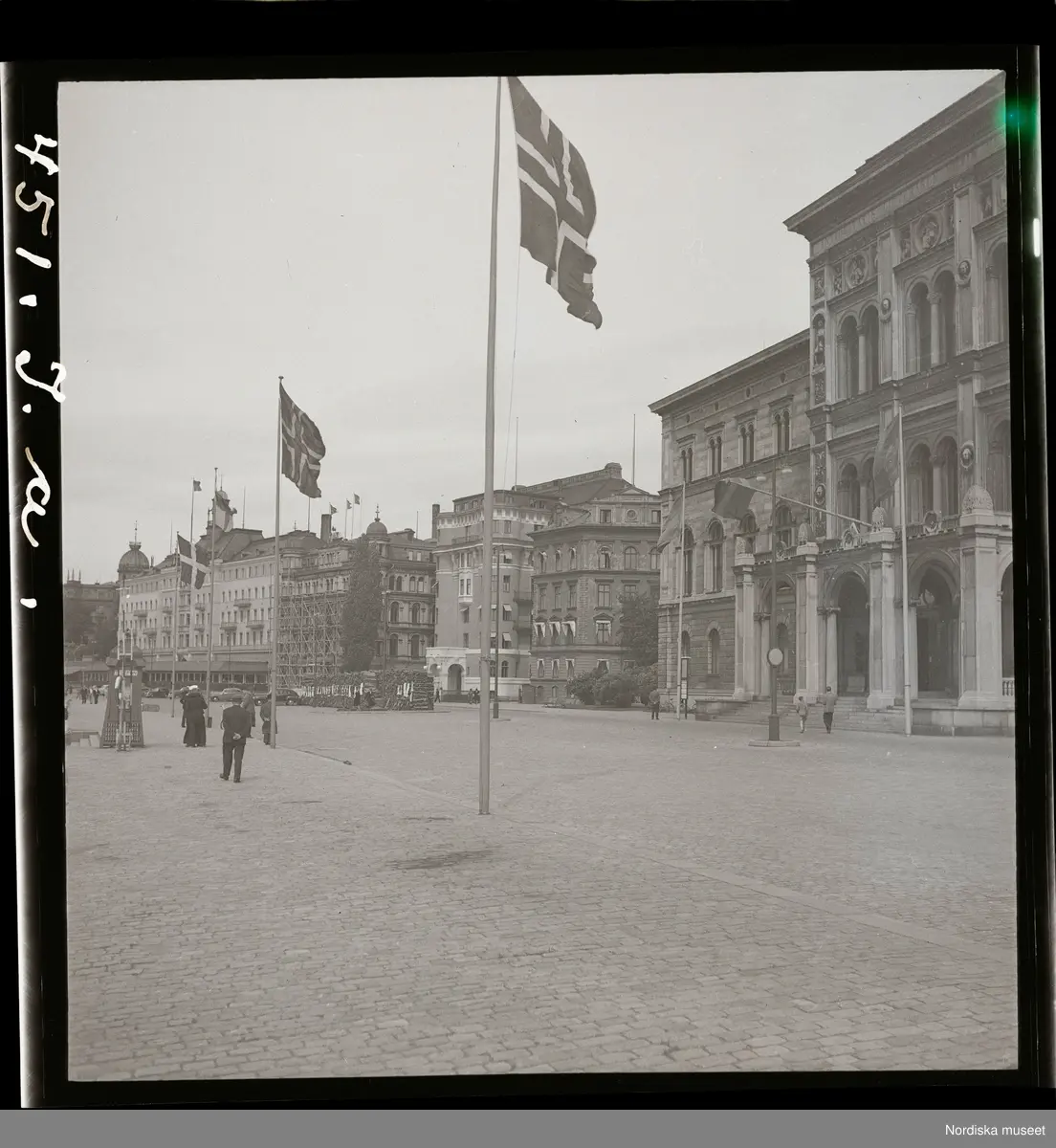 Norska (?) flaggor utanför Nationalmuseum, Stockholm.