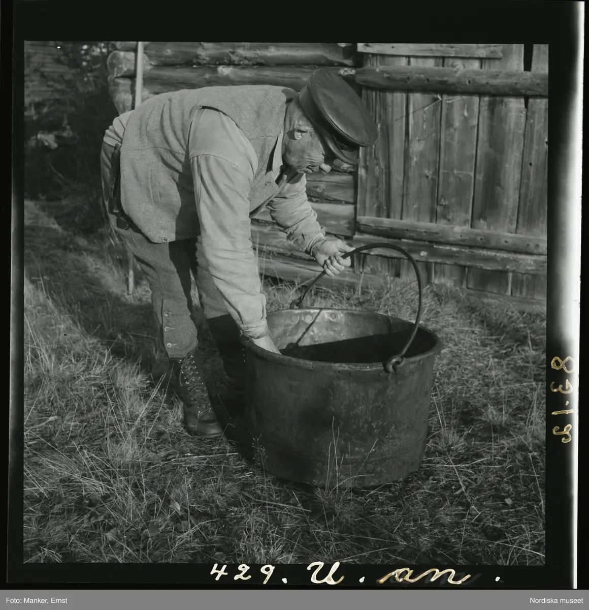 En man böjer sig ner över en stor kopparkittel. Strömsudden, Västra Kikkejaur.