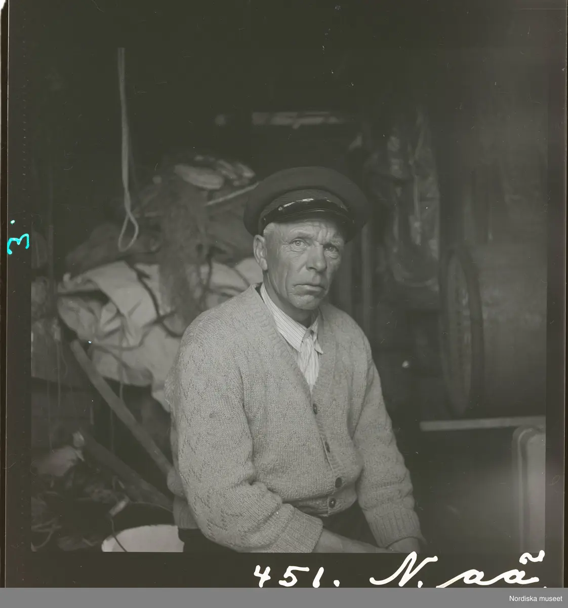 Porträtt av en man i skärmmössa, sittandes i båthus/ förråd.