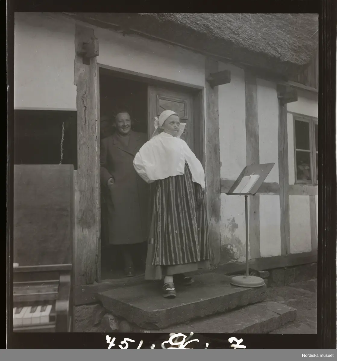 En kvinna i folkdräkt står på trappsteget in till ett hus och sjunger. Intill och ett piano. Skansen, Stockholm.