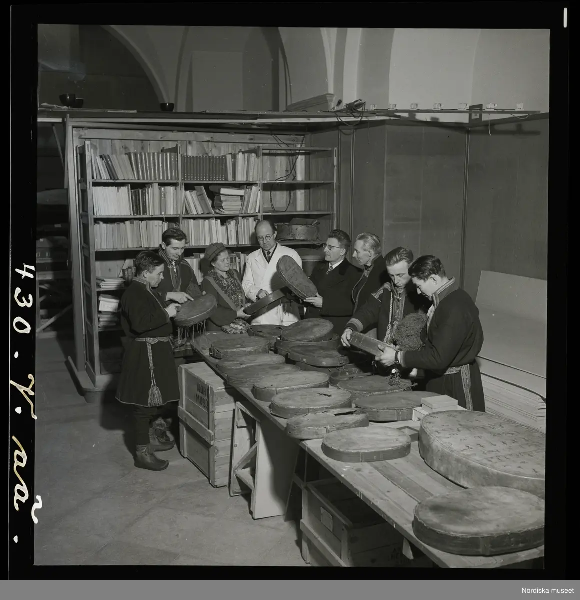 Delar av 1945 års samedeputation studerar trummor vid ett besök på Nordiska museet. Bilden fr. v. : Mattias Kuoljok, John Utsi, Anna Gustafsson, int. Ernst Manker, kyrkoherde Gustav Park, Petrus Gustafsson, Isak Parffa och Nils Erik Kuoljok.