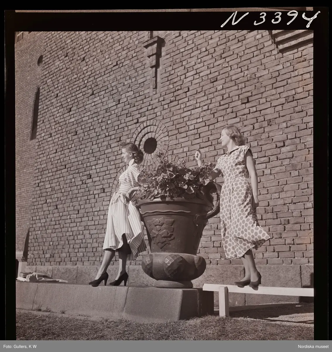 1708 N Mölnlycke väverier, mode; Stadshusträdgården, Stockholm; Mode för Mölnlycke. Två modeller poserar vid stor urna framför Stadshuset.