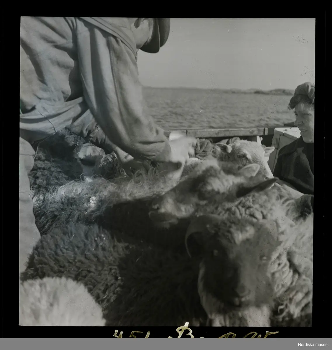 Titel: Fåren hämtas ombord i jullen för att föras över till Kongsö. Fårskötseln på Vrångö håller på att försvinna liksom tidigare det egentliga åkerbruket. Då de flesta hushållen hade får och antalet höll sig mellan 200 och 300 var betesgången och foderfångsten strängt reglerad, och senast 12 maj skulle djuren över till betesholmarna. 1951 håller endast en av de fem fårägarna, gamle Karl Olsson (f. 1869) fast vid detta datum.