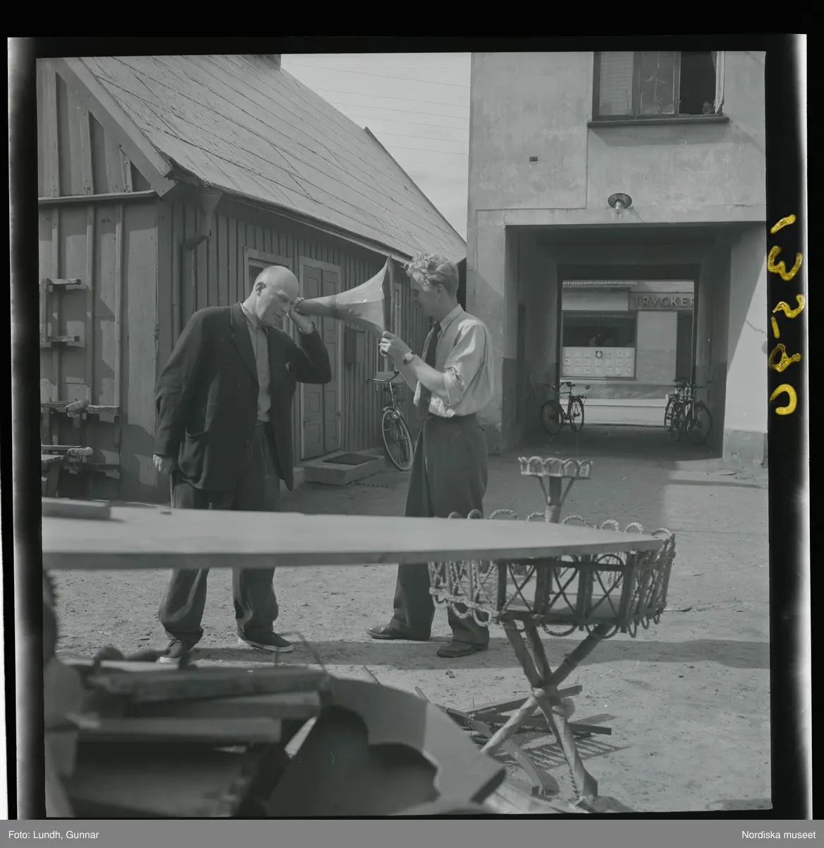 Fotograf Gunnar Lundh och en ung man roar sig med tratten till en gammal grammofon. De står utomhus intill en hög med bråte, möbler och redskap.