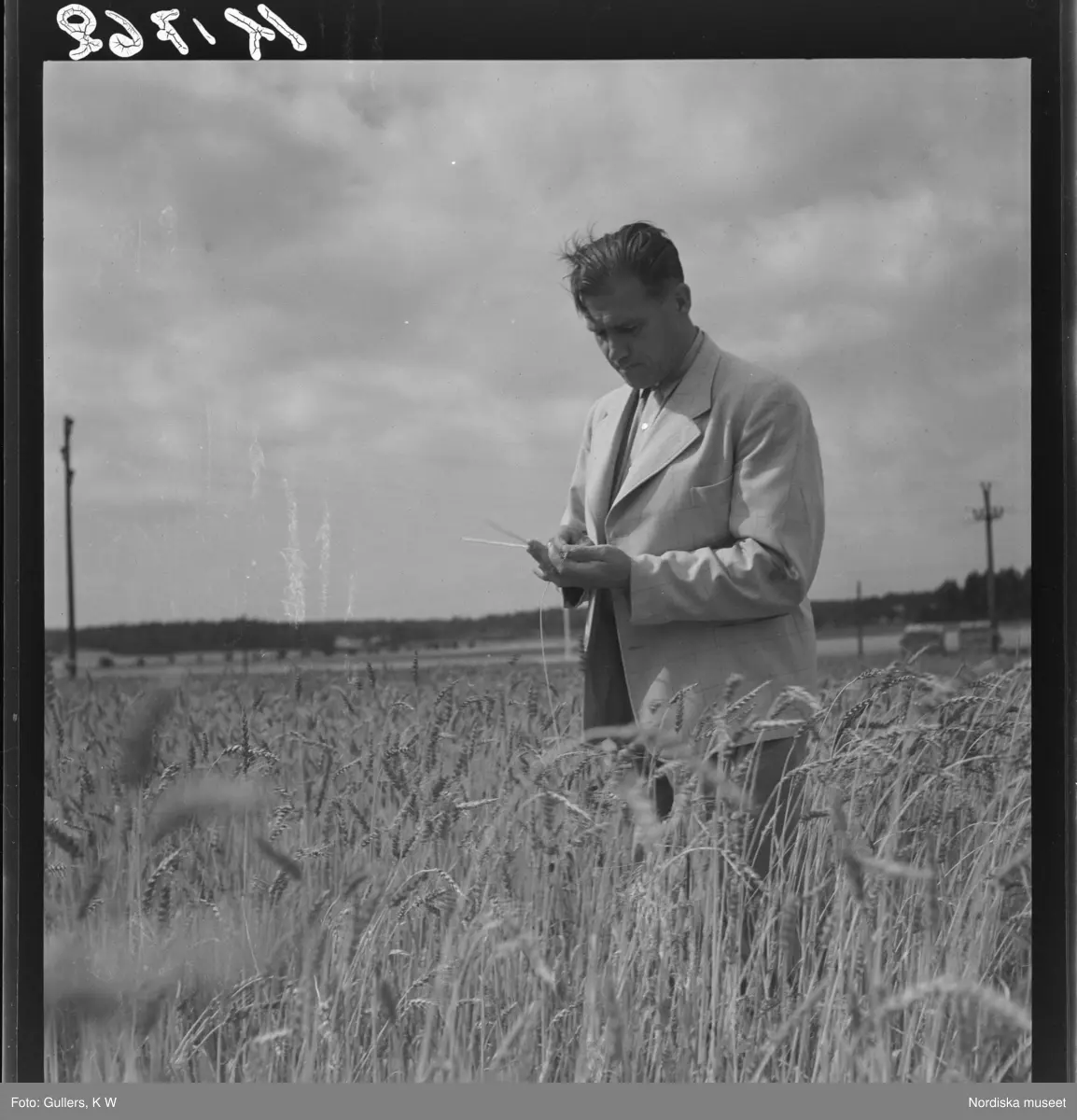 507 B Ultuna. En man inspekterar grödor på en åker.