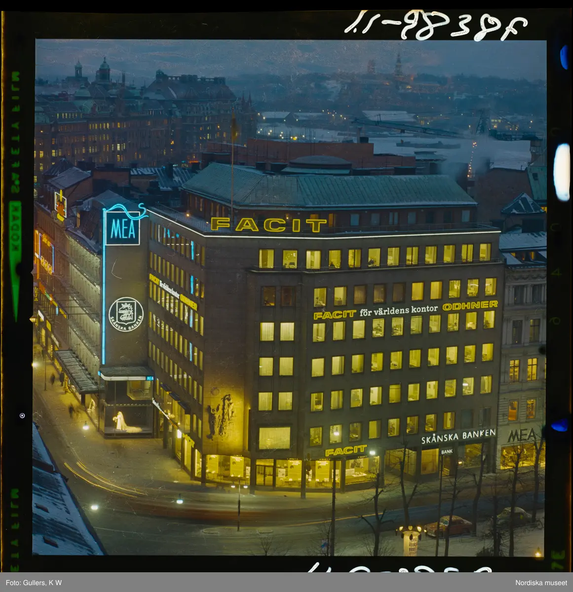 585/40 Facit Nattbild från N.K + Södra Kungstornet. Kvällsbild. Facit-skylt på taket av fastigheten Styrpinnen 22, ritad av arkitekt Ivar Tengbom i hörnet Hamngatan / Kungsträdgårdsgatan i Stockholm.