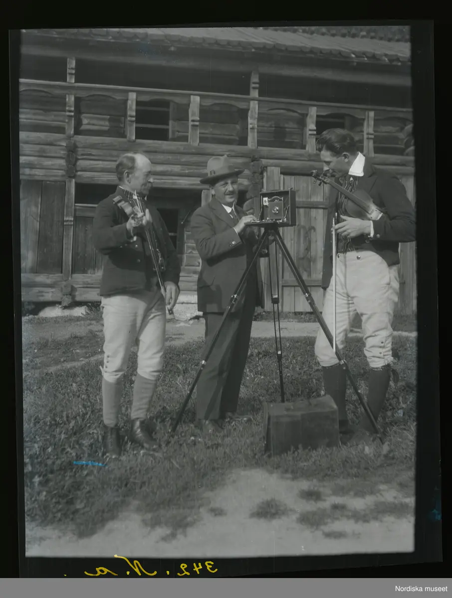 En fotograf har ställt upp sin kamera mellan två fiolspelande män i folkdräkt. Skansen, Stockholm.