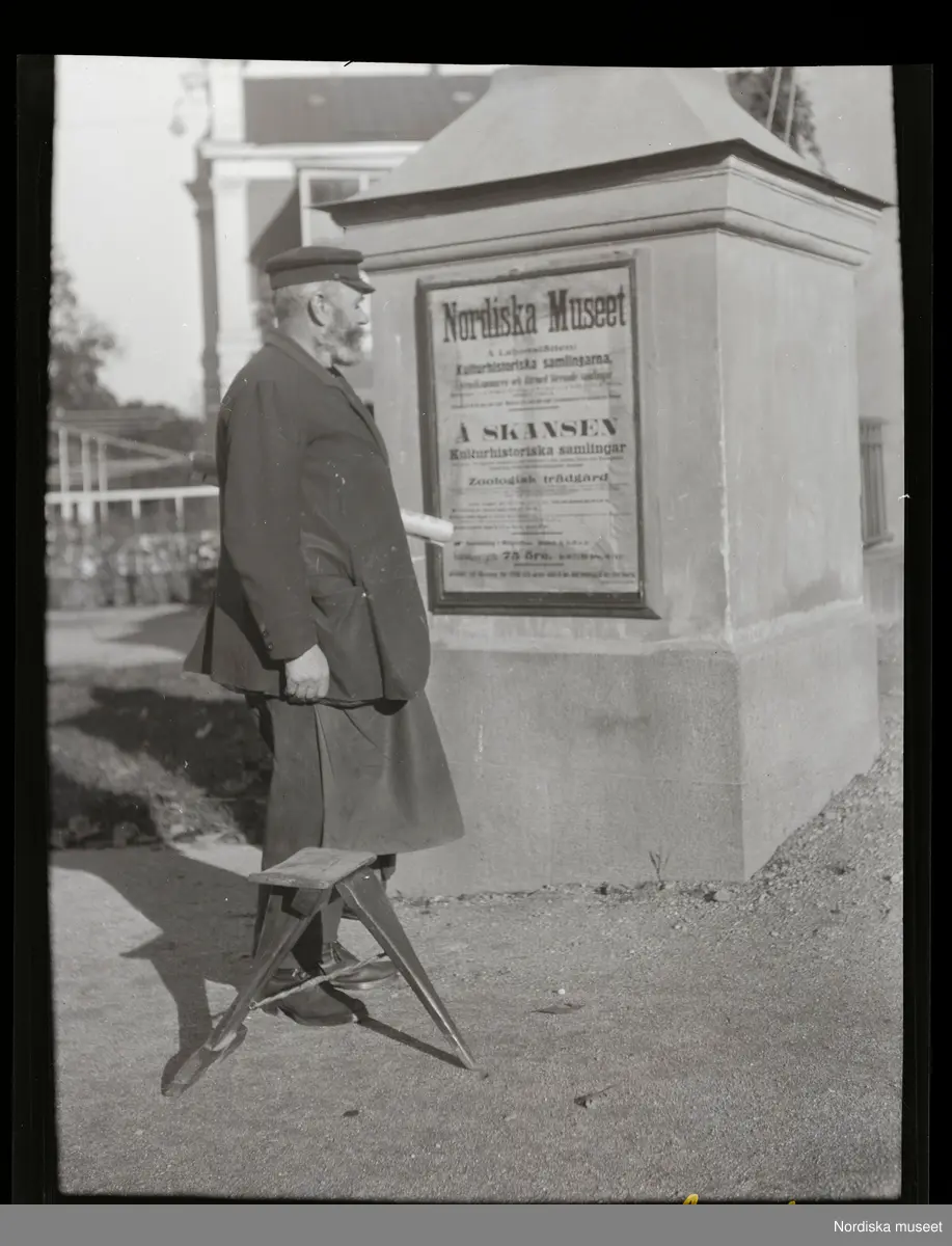 Man framför en affisch som gör reklam för Nordiska museet och Skansen. Djurgården, Stockholm.