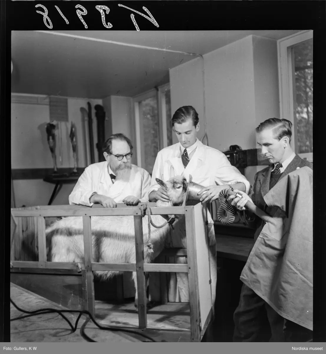 507 D Ultuna. Studier av get. Studenter sätter en mask över en gets ansikte.
