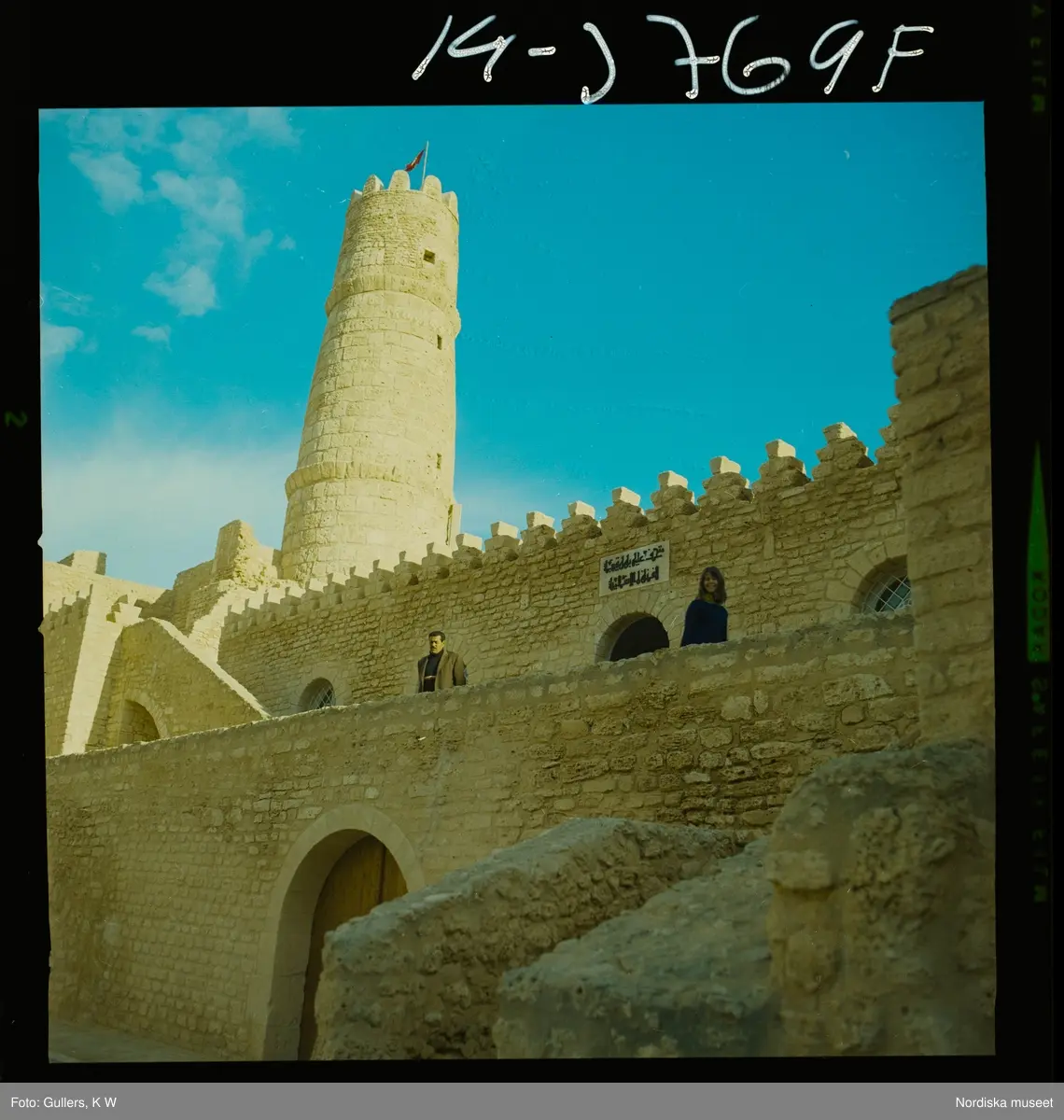 2791 Tunisien. En kvinna besöker en stenbyggnad tillsammans med en lokal guide.