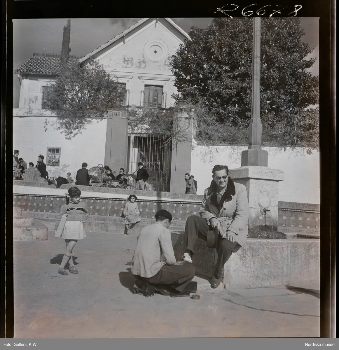 568 F. Stieg Trenter, Torremolinos. Stieg Trenter får sina skor putsade vid en springbrunn på ett torg.