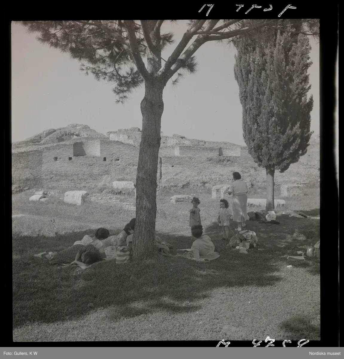 1717/A Rom. Ett sällskap med kvinnor och barn ligger och vilar i gräset framför ruiner.