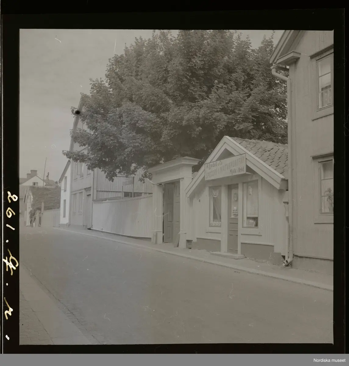 Gatubild. Butik med skylt: A. Lindell & Co. Speceri- & Matvaruaffär. Mjölk & Bröd.