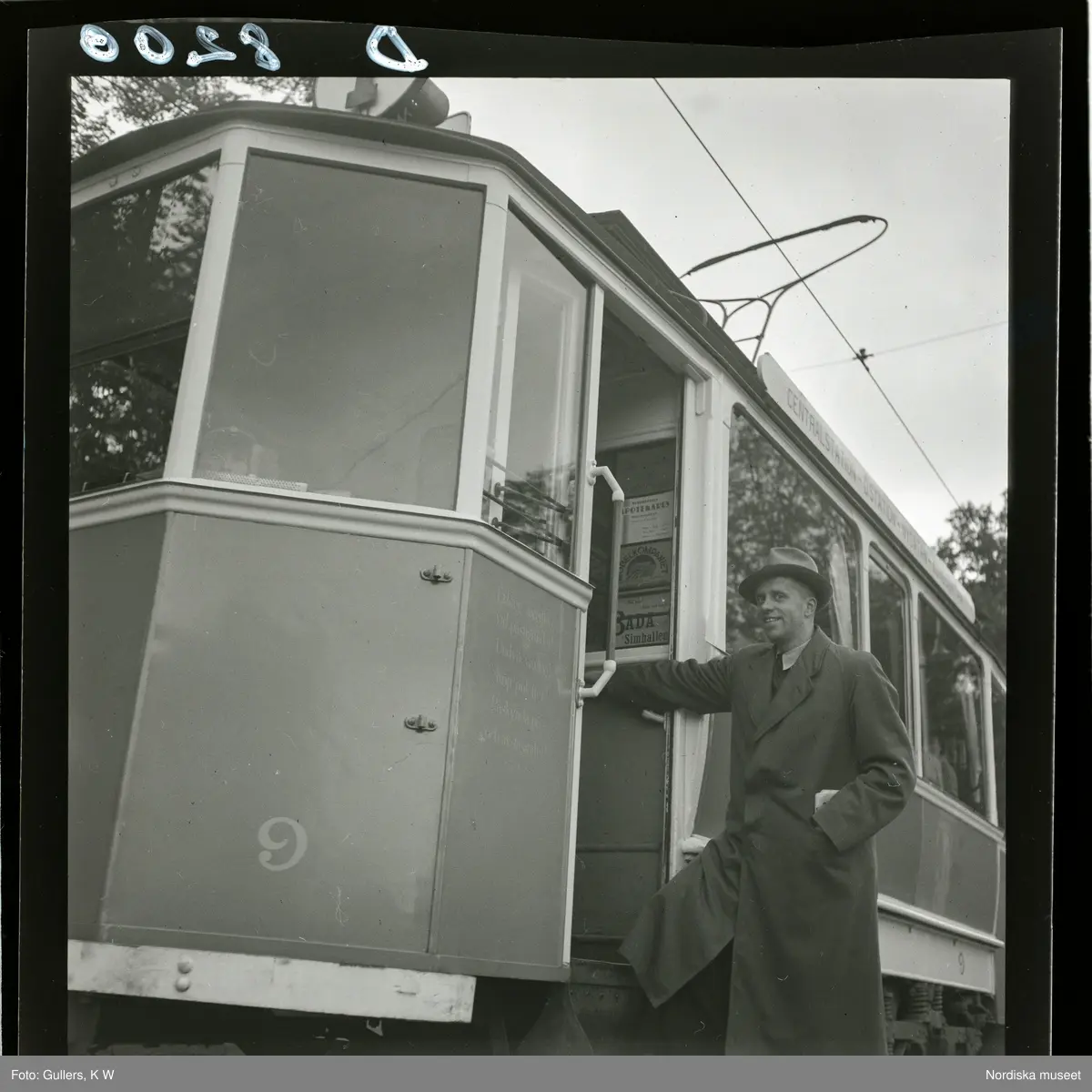 Journalist P. Wange påväg att stiga på spårvagn i Norrköping.