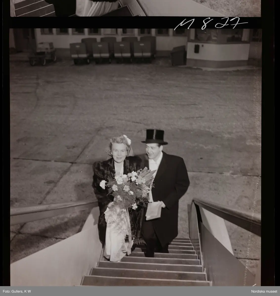 "1680 Bröllop i luften med Abas DC-4 ""Sunnan"" till Paris " Ett brudpar går uppför trappan till ett flygplan.