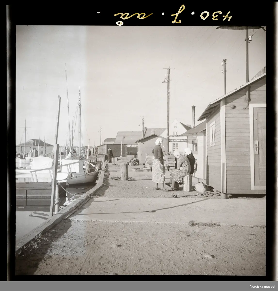 Text på montering i arkivet: På kajen halv 7 på morgonen i väntan på fiskebåtarna. Fiskförsäljerskor sittande vid skjulet "Fiskarnas fiskexport".