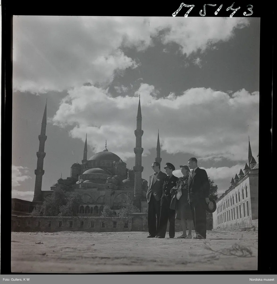 1717/K Istanbul allmänt. Fotograf K W Gullers (t.v.) med sällskap framför Blå moskén/ Sultan Ahmed camii.