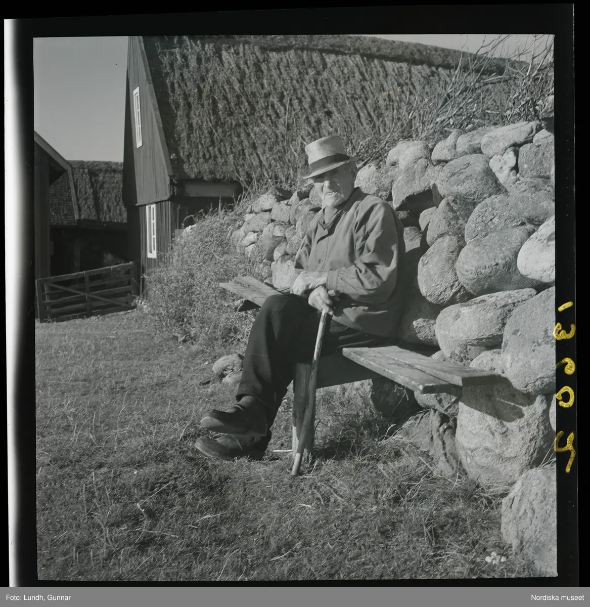 En äldre man sitter på en bänk gjord av ett par plankor som vilar på stöttingar inkilade i en stenmur.