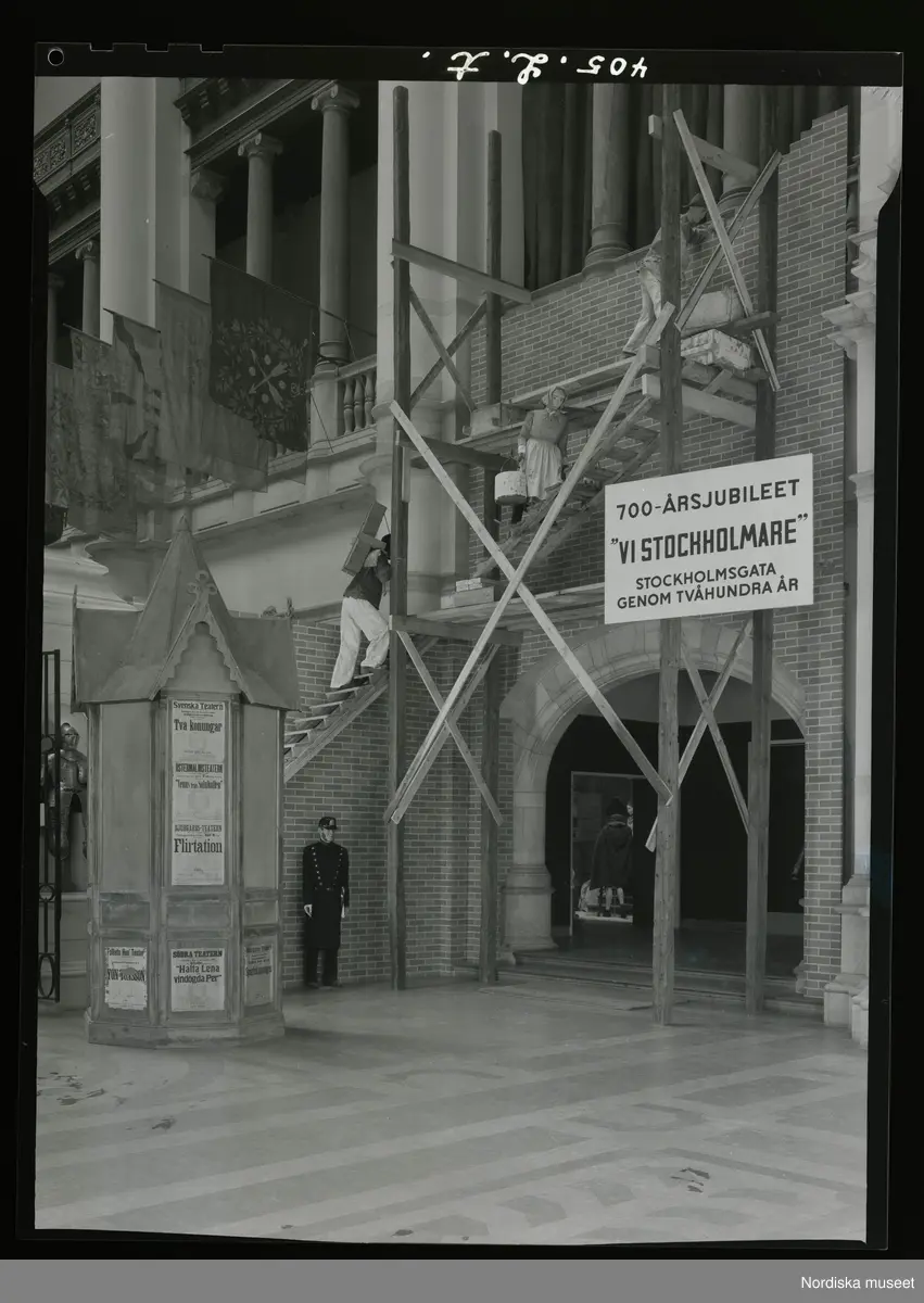 Dokumentation av utställning i stora hallen på Nordiska museet. På en skylt står: 700-årsjubileet "Vi Stockholmare" Stockholmsgata genom tvåhundra år.