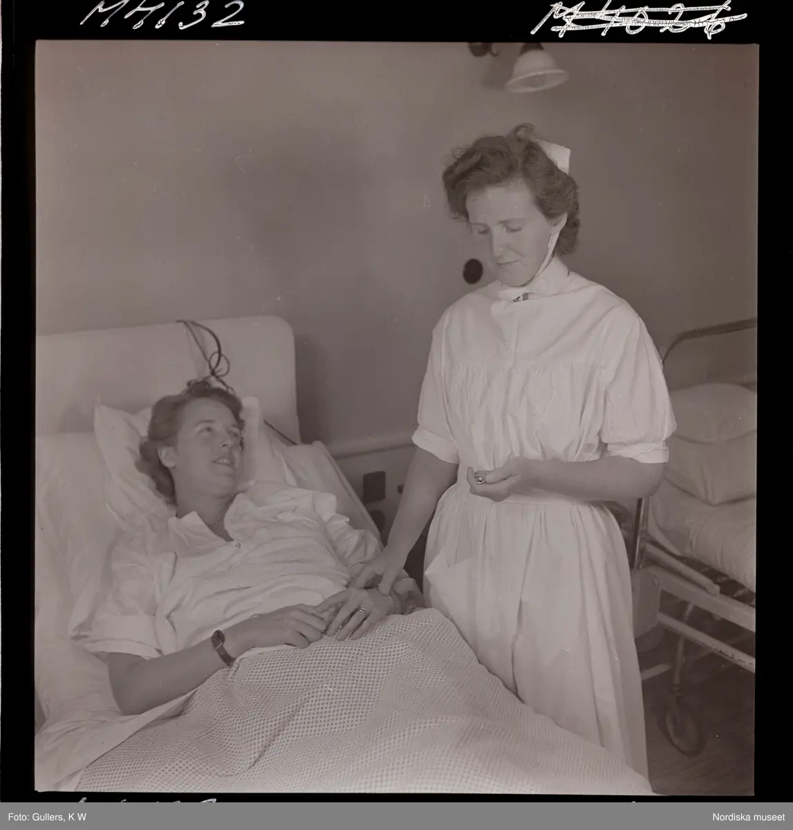 1711 En sjuksköterskas arbetsdag. En sköterska undersöker en patient i säng.