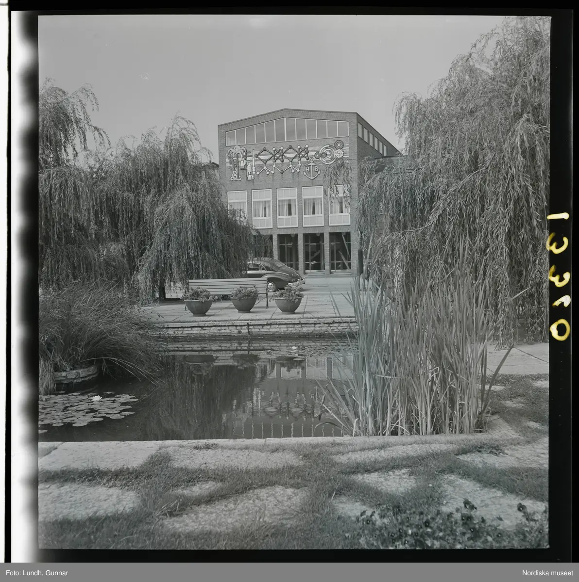 Damm framför Höganäs AB laboratoriebyggnad med fasadutsmyckning.