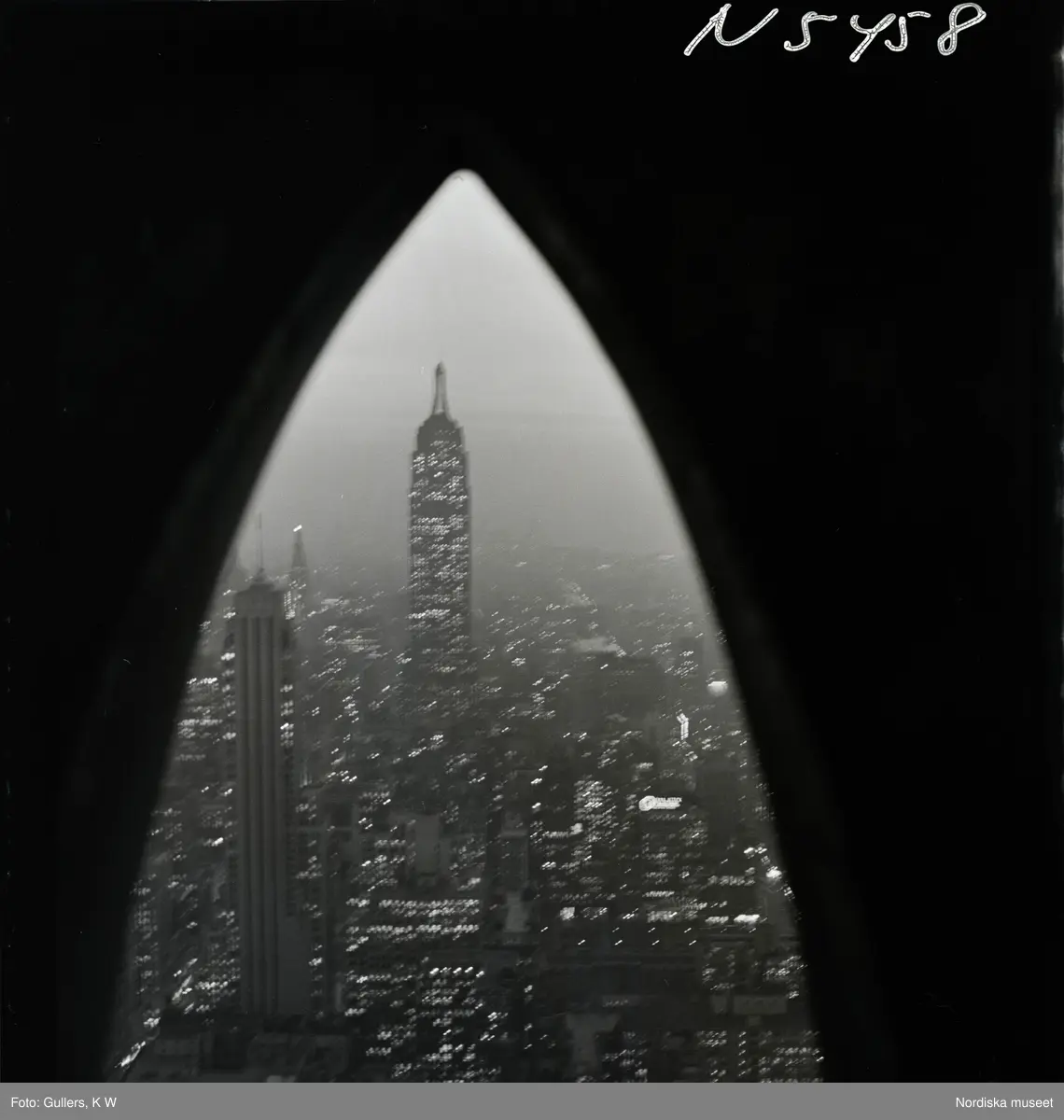 1690 New York allmänt (N.Y. Herald Tribune). Vy över stadens skyskrapor, Empire state building. kvällsbild.