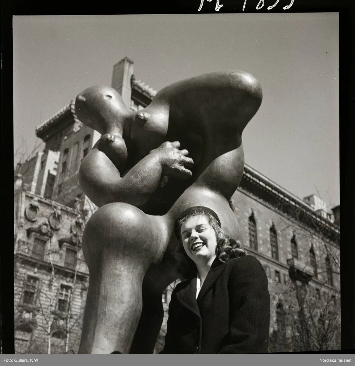 1690 A New York, allmänt. Leende kvinna framför en skulptur på ett torg.