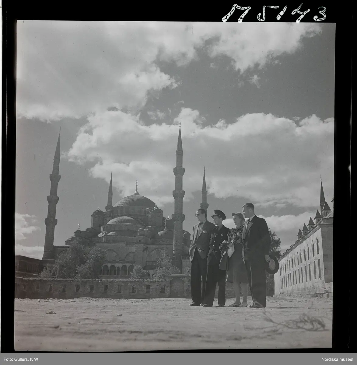 1717/K Istanbul allmänt. Fotograf K W Gullers (t.v.) med sällskap framför Blå moskén/ Sultan Ahmed camii.