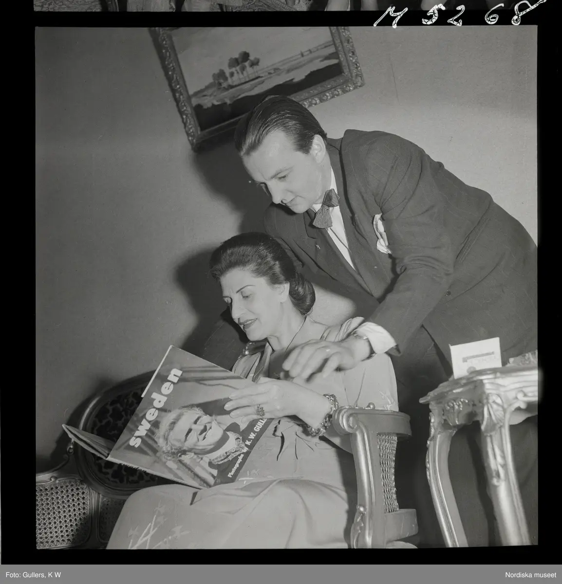 Istanbul. En kvinna sitter och läser i "Sweden" av K W Gullers. Bakom henne står K W Gullers själv och visar på något i boken.